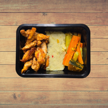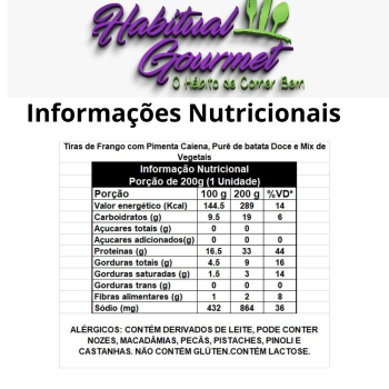 1, 2 ou 3 unid - Tiras de Frango com Pimenta Caiena, Purê de Batata Doce e Mix de Vegetais