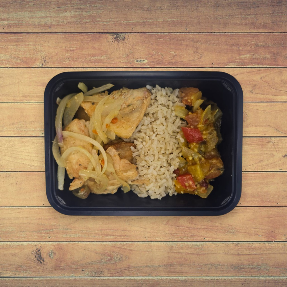 1 ou 2 Unid. Filézinhos de Frango Acebolado com Caponata de Legumes e Arroz