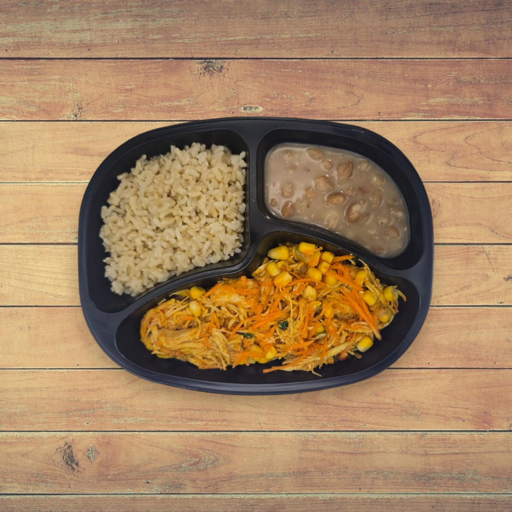 1 ou 2 Unid. Frango Desfiado ao Molho Fresco com Cenoura e Milho, Arroz Integral e Feijão Carioca