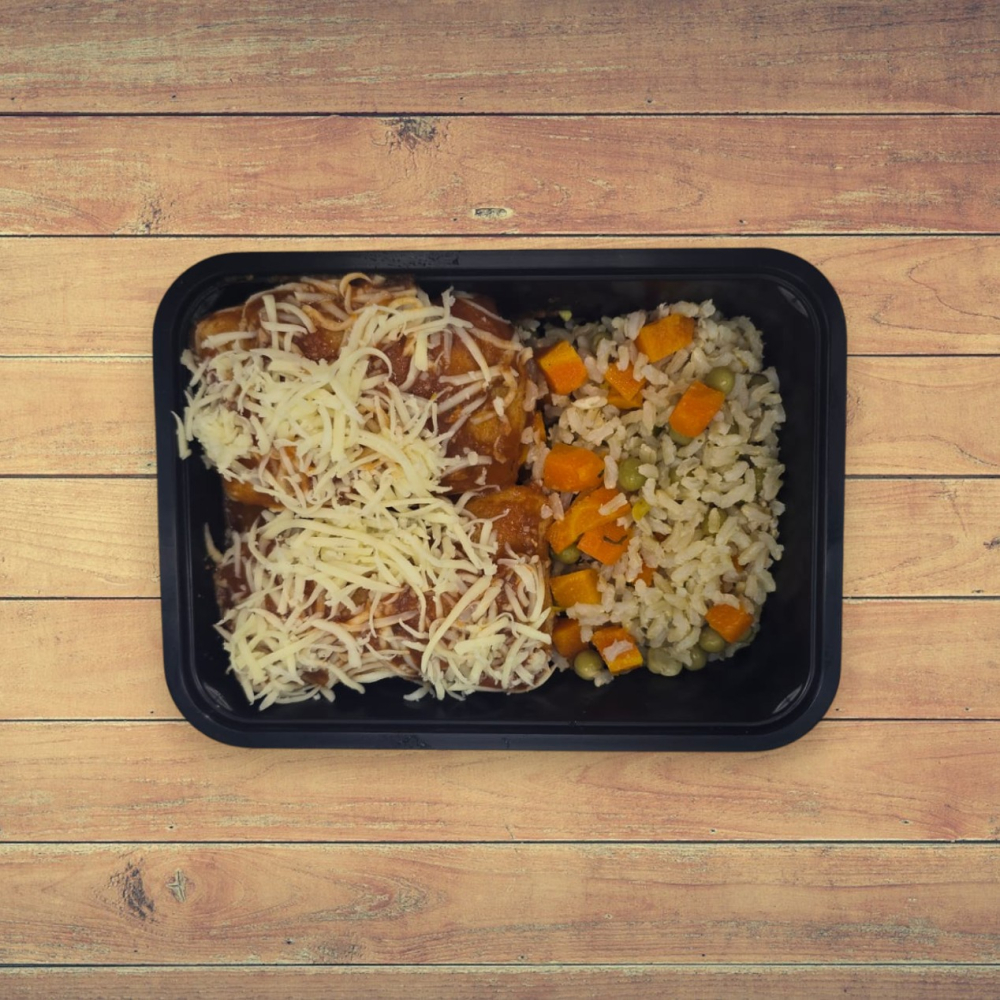 1 ou 2 Unid. Panqueca Recheada com Patinho Moído e Cenoura Ralada ao Molho Fresco e Arroz Primavera