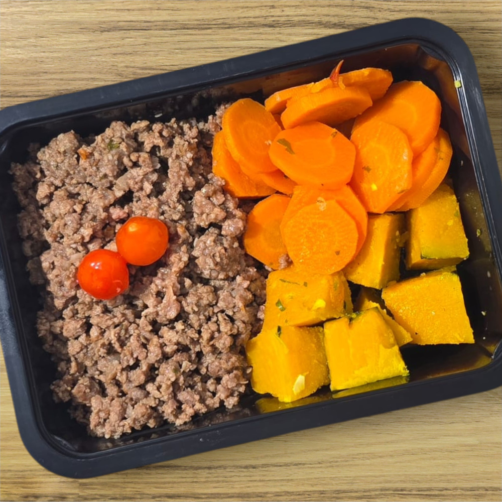 Patinho moído refogado com carinho, bem temperadinho e cheio de sabor, combinado com cenoura e abóbora macias que derretem na boca.