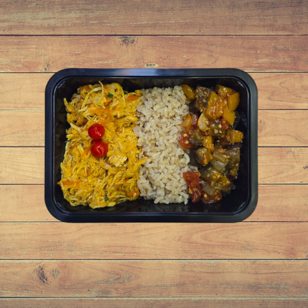 - 1 ou 2 Unid. Frango Desfiado ao Molho Fresco com Cenoura Ralada, Arroz e Caponata de Legumes