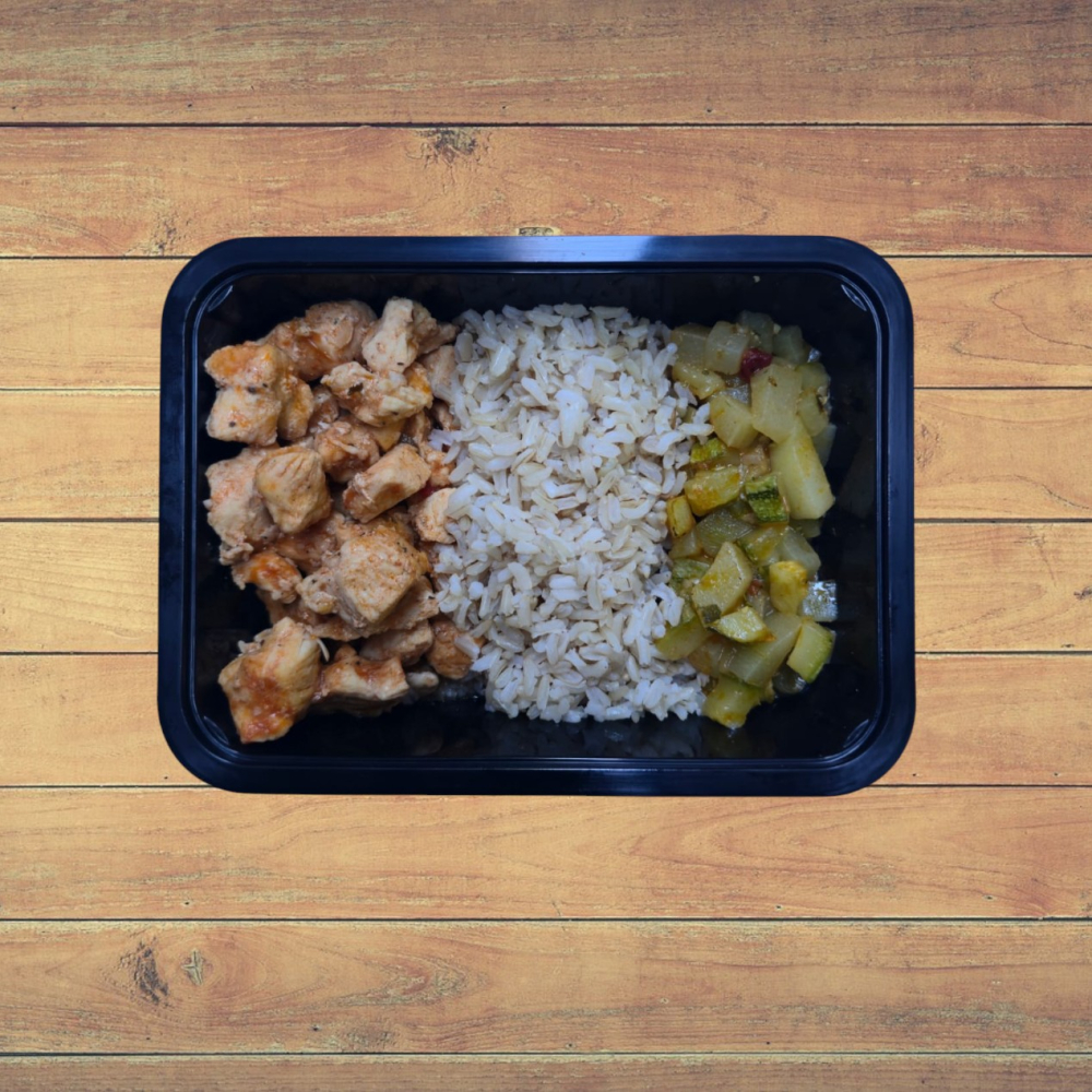 - 1 ou 2 Unid. Cubos de Frango com Arroz, Abobrinha e Chuchu Refogado