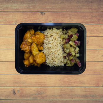 - 1 ou 2 Unid. Cubos de Frango ao Molho de Laranja e Mel, Batata Doce Rústica e Arroz