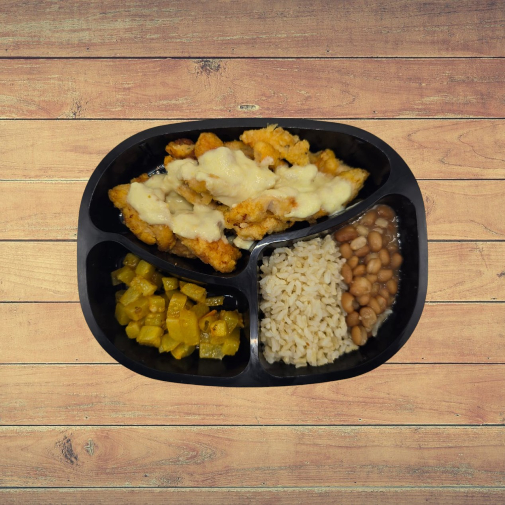 1 ou 2 Unid. Tiras de Frango a Milanesa com Creme de Milho, Arroz, Feijão Carioca e Chuchu Refogado