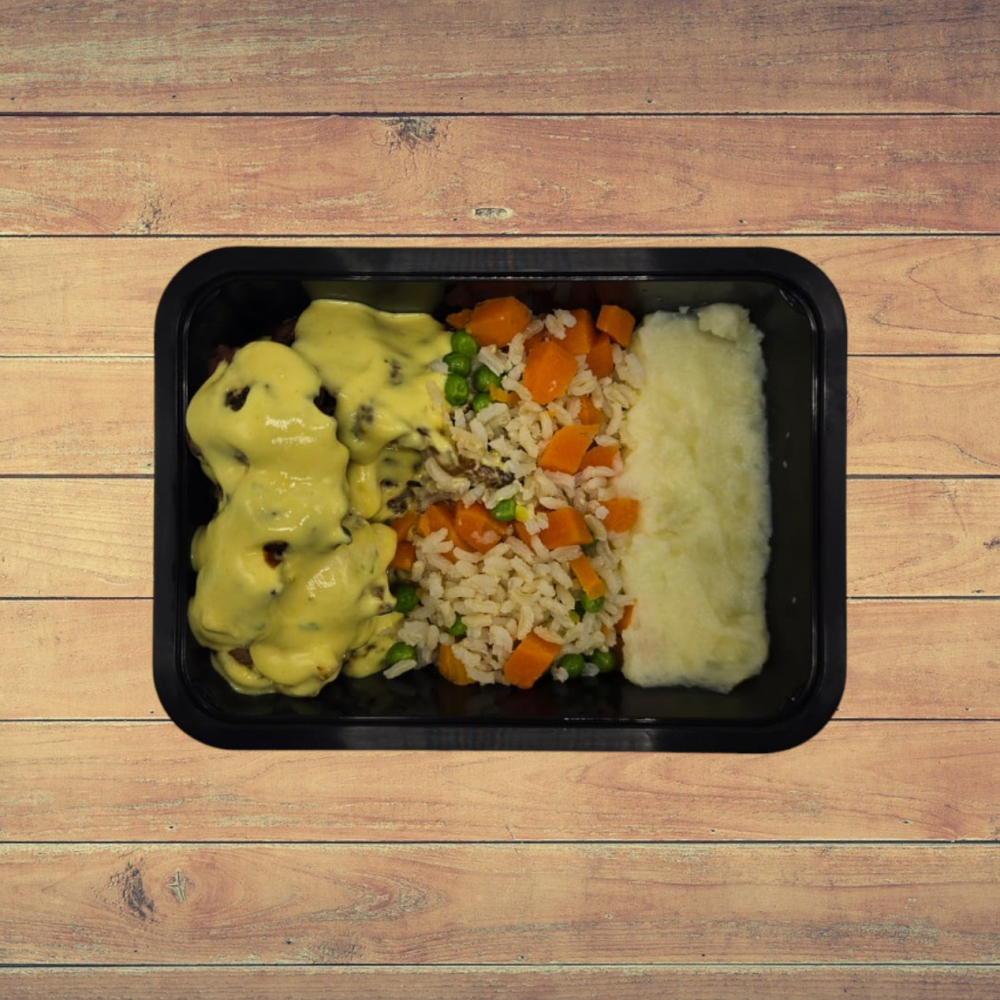 1 ou 2 Unid. Sobrecoxa Desossada ao Molho Mostarda com Arroz Primavera e Purê de Batata Inglesa