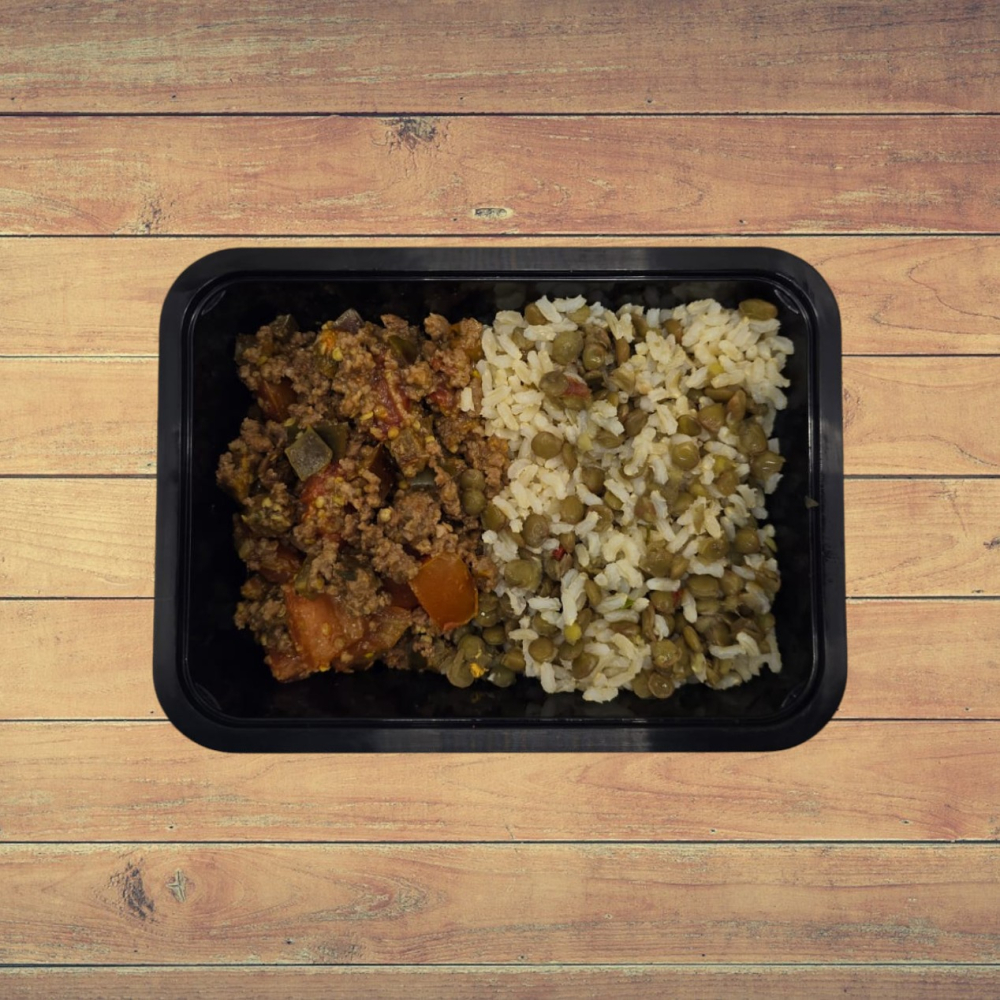 1 ou 2 Unid. Patinho Moído Refogado com Berinjela e Tomate e Arroz com Lentilha