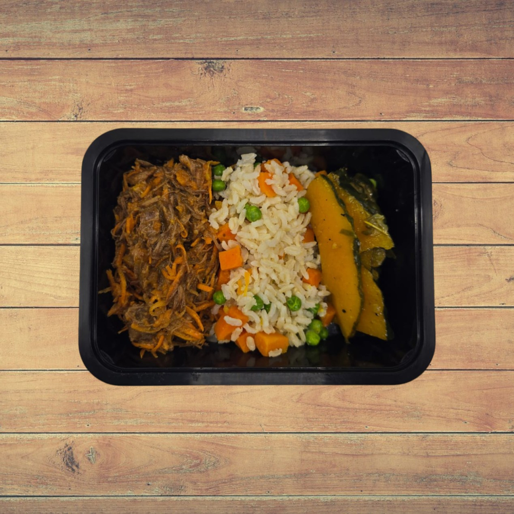 1 ou 2 Unid. Patinho Desfiado com Abóbora Rústica Assada e Arroz Primavera
