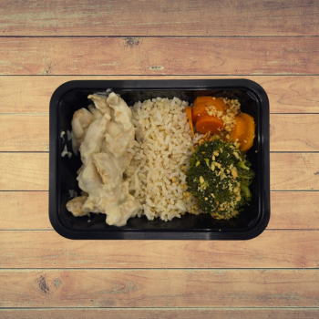 1 ou 2 Unid. Tiras de Frango ao Molho Branco, Arroz, Cenoura e Brócolis ao Alho