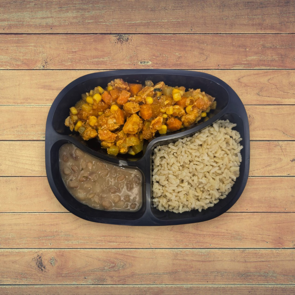 1 ou 2 Unid. Cubos de Frango Refogado com Milho, Cenoura e Chuchu, Arroz e Feijão Carioca