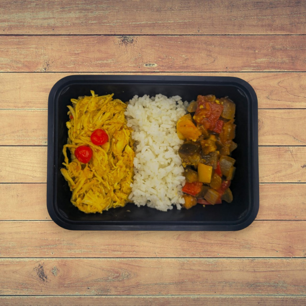 1 ou 2 Unid. Frango Desfiado ao Molho Fresco com Cenoura Ralada, Arroz e Caponata de Legumes