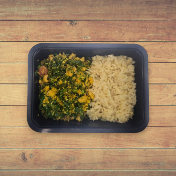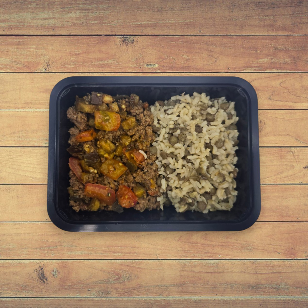 1 ou 2 Unid. Patinho Moído Refogado com Berinjela e Tomate e Arroz com Lentilha