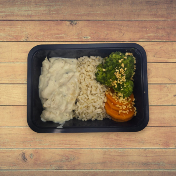 1 ou 2 Unid. Tiras de Frango ao Molho Branco, Arroz, Cenoura e Brócolis ao Alho