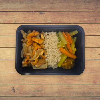 1 ou 2 Unid. Tiras de Frango Acebolado com Arroz e Mix de Vegetais