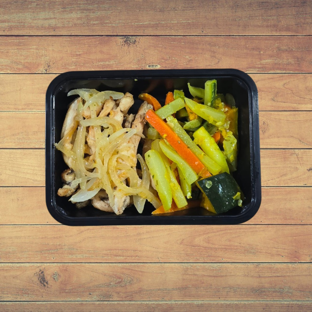 1 ou 2 Unid. Tiras de Frango Acebolado com Mix de Vegetais
