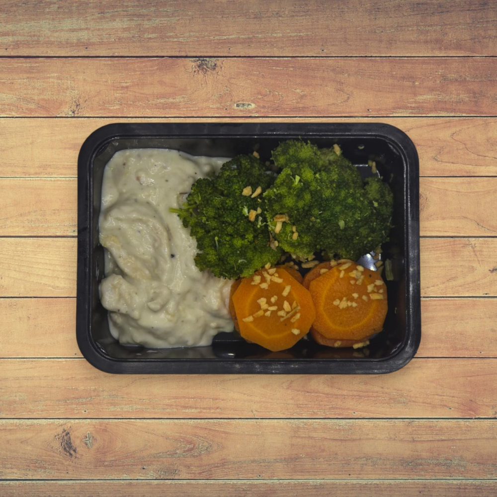 1 ou 2 Unid. Tiras de Frango ao Molho Branco com Cenoura e Brócolis ao Alho